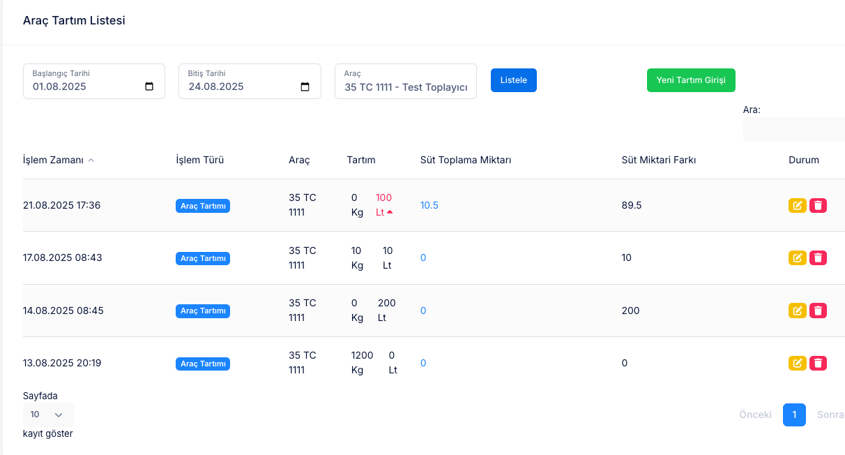 Araç süt toplama işi bittikten sonra tartıma çıkıyorsa, yetkili yada sisteme tanımlanan tartımcı tartımı sisteme girdiğinde içindeki süt miktarı ile farkı hemen görünüyor.