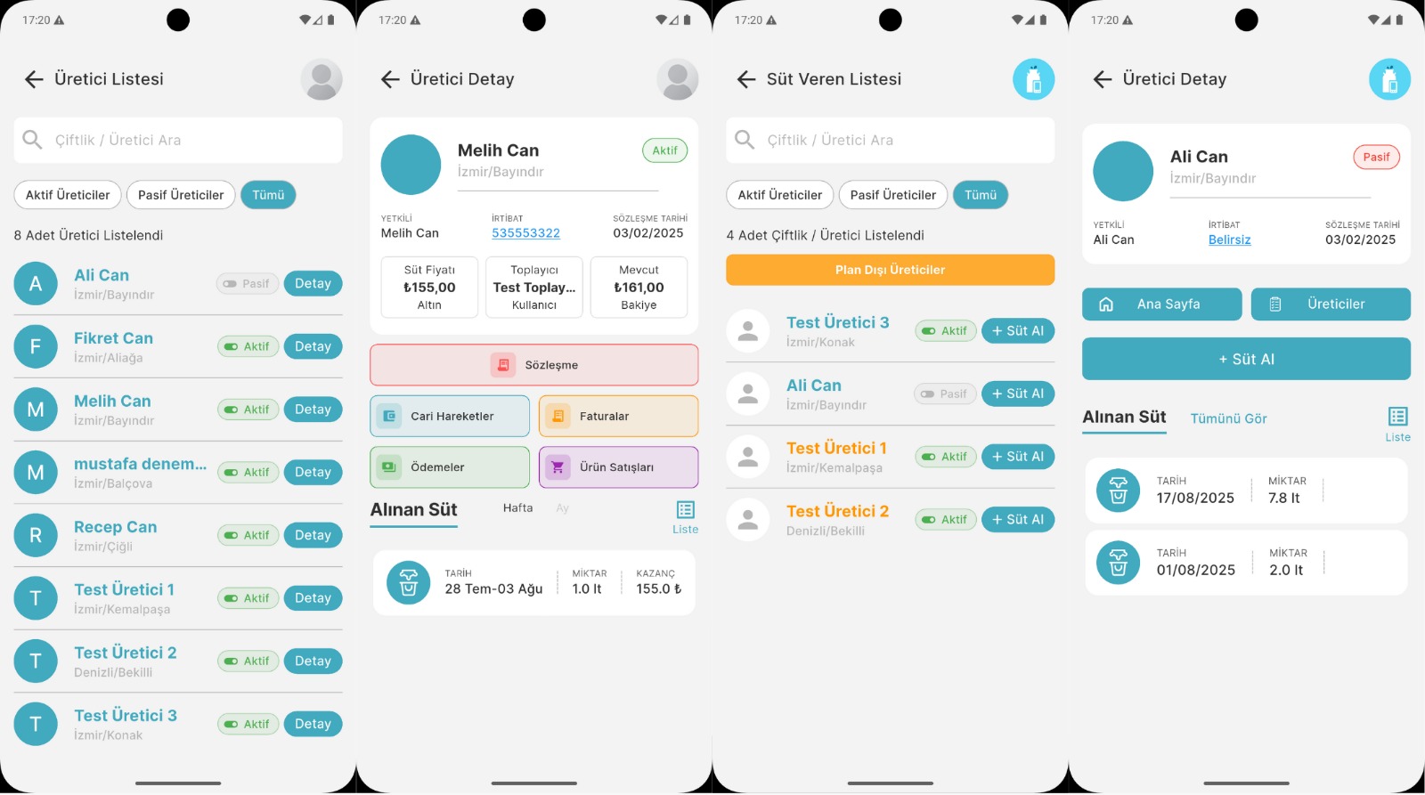 Toplayıcıya tanımlanmış çiftlikler ve üreticiler sadece ekranında görünür. İstenildiği halde yerine bakan yedek şöför varsa tanımlanabilir, rota dışı planlama ile arada sütünü aldığı çiftlikler tanımlanabilir.