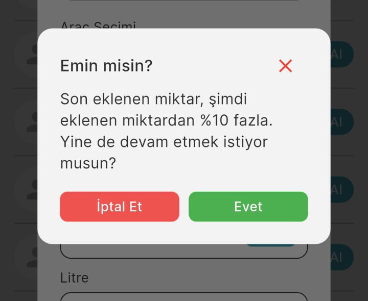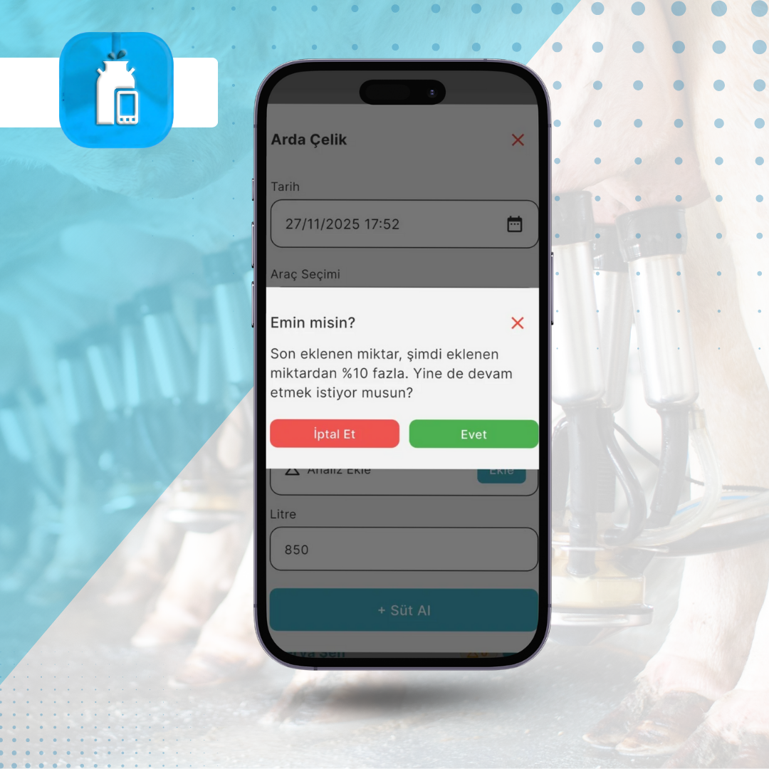 Toplayıcı sütü kayıt ederken yanlışlık bir rakam eksik, fazla veya hatalı girmesi durumunda; son aldığı süt miktarı baz alınarak %10 fazla veya eksik girildiğinde ekrana uyarı çıkarıyoruz. Buna rağmen verinin kayıt edilmesi durumunda bu bildirimi üreticiye ve firma yetkilisine bildirim olarak gönderiyoruz.