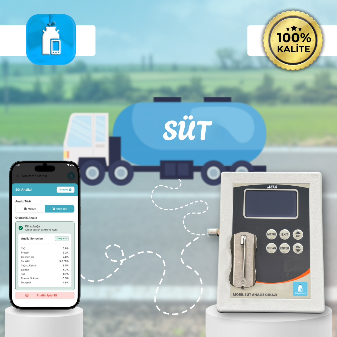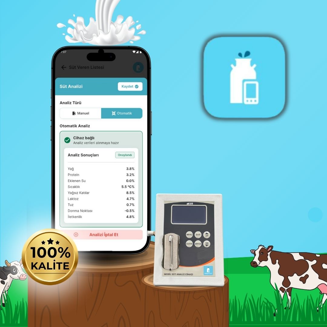Sütçü Mobil ile isterseniz analiz cihazımız ile Yağ, Yağsız Katılar SNF, Yoğunluk, Protein, Laktoz, Tuzlar, Su Miktarı, Donma Noktası, Sıcaklık ve pH değerlerini 2 Dakikada öğrenebilirsiniz.