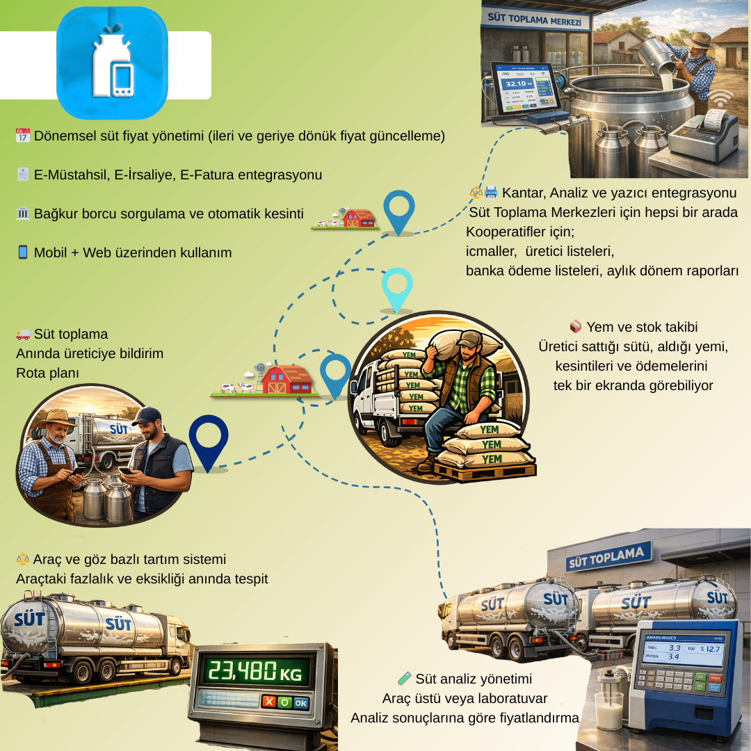 Süt analiz yönetimi (araç üstü veya laboratuvar entegrasyonu, sonuçlara göre otomatik prim/ceza)