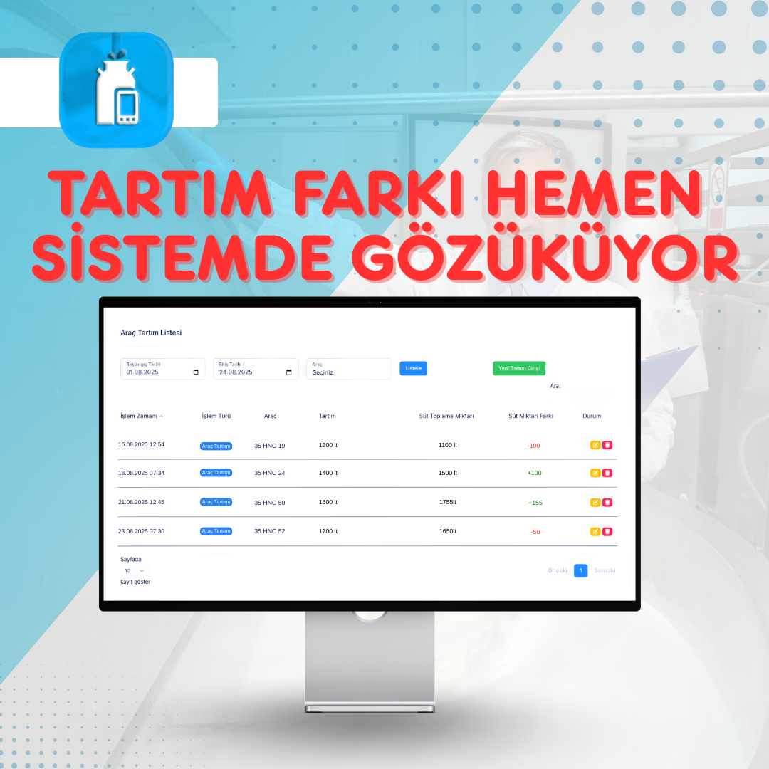 Araç süt toplama işi bittikten sonra tartıma çıkıyorsa, yetkili yada sisteme tanımlanan tartımcı tartımı sisteme girdiğinde içindeki süt miktarı ile farkı hemen görünüyor.